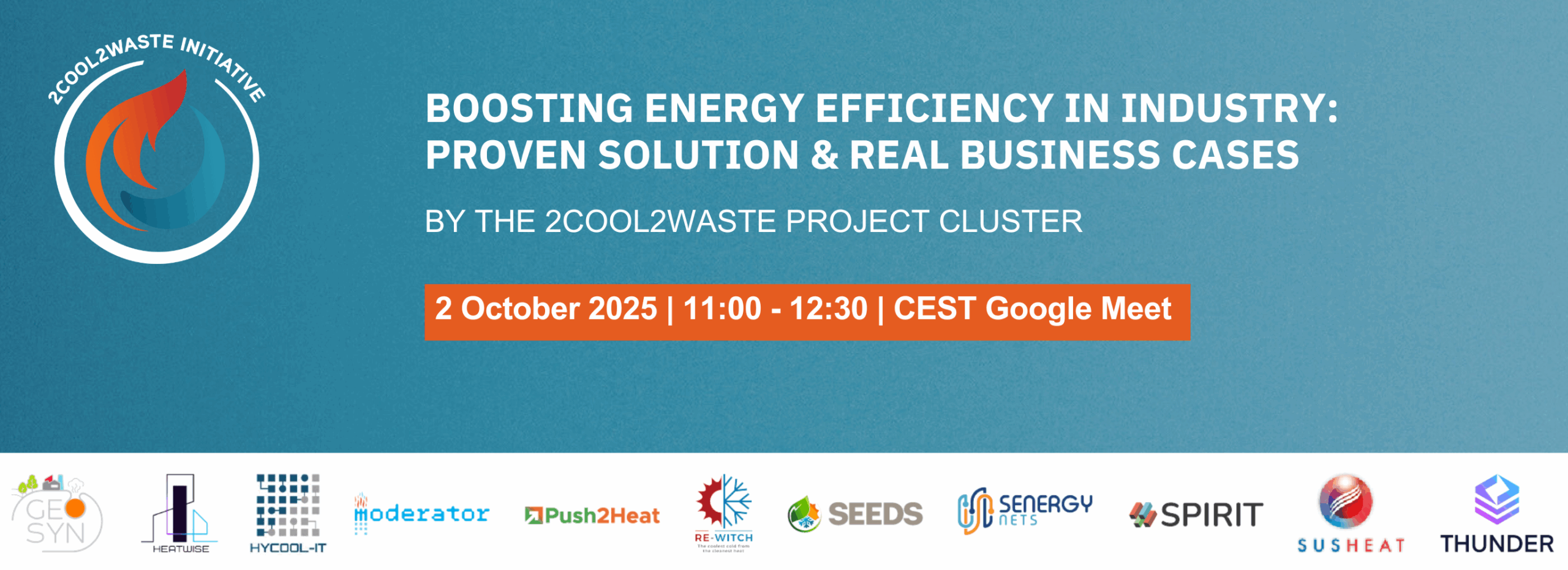 Join us on 2 October for an interactive webinar on “Boosting energy efficiency in industry: proven solutions & real business cases“. This event is organized in the framework of the 2Cool2Waste Cluster, which brings together fifteen Horizon Europe projects on renewable energy, waste heat recovery, and thermal management.